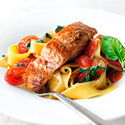 Łosoś z makaronem, pomidorkami koktajlowymi i bazylią